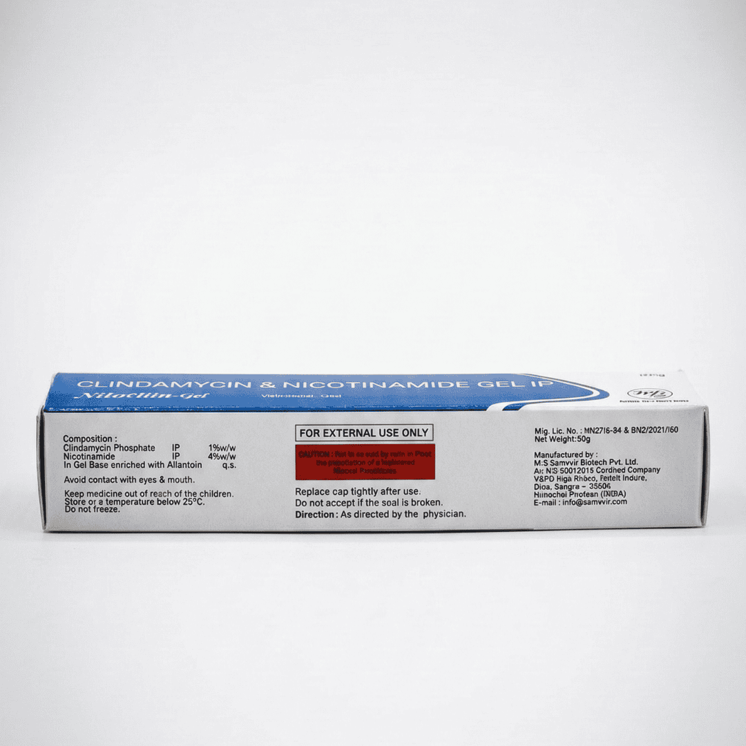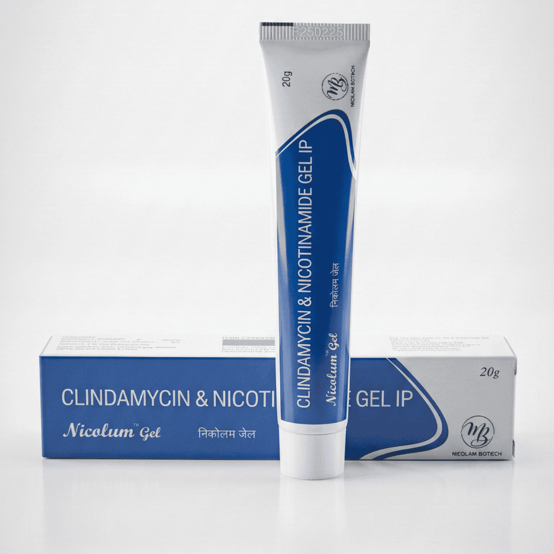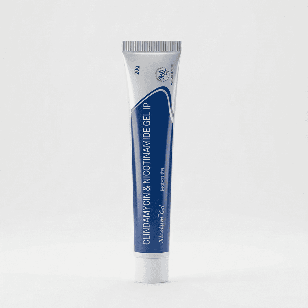 Nicolum Gel is a topical acne treatment designed to effectively manage pimples, acne, and skin inflammation. This dermatologically recommended formula combines Clindamycin, an antibacterial agent that helps eliminate acne-causing bacteria, with Nicotinamide (Vitamin B3), which helps reduce redness, inflammation, and excess oil production.
